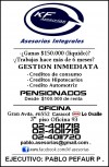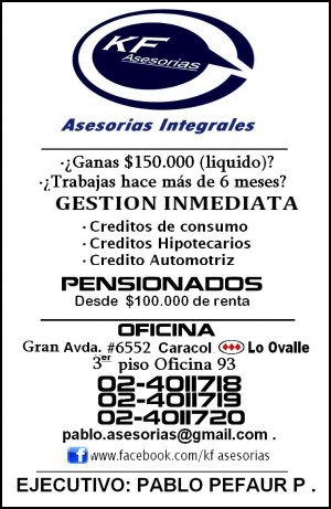 SOMOS LA OPCION A TUS NECESIDADES . Ganas mas de $150.000 (liquido) • Trabajas Hace mas de 6 Meses "GESTIONAMOS EXPRESS" ..CONSULTANOS ... • Creditos Hipotecarios • Creditos de Consumo *(BUSCAMOS LO QUE MAS TE CONVIENE, SEGUN TU PERFIL) Fonos: 4011718 / 4011719 /4011720 Cel: 06-6850959 Ejecutivo: Pablo Pefaur P .
