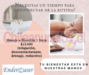 en Enderlaser tenemos una excelente promoción 1 hora de masaje a solo 15mil pesos tu decides que masaje y en que zona lo quieres. (relajación, descontracturante, drenaje linfático, reductivo, reflexología, entre otros).