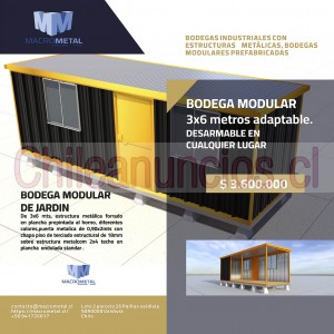 Bodega modular de jardin ,estructura metalica forrado en plancha  prepintada al horno, diferentes colores, puerta metalica de 0,90x2mts con chapa, piso de terciado estructural de 18mm sobre estructura metalcom 2x4   techo en plancha  ondulada standard